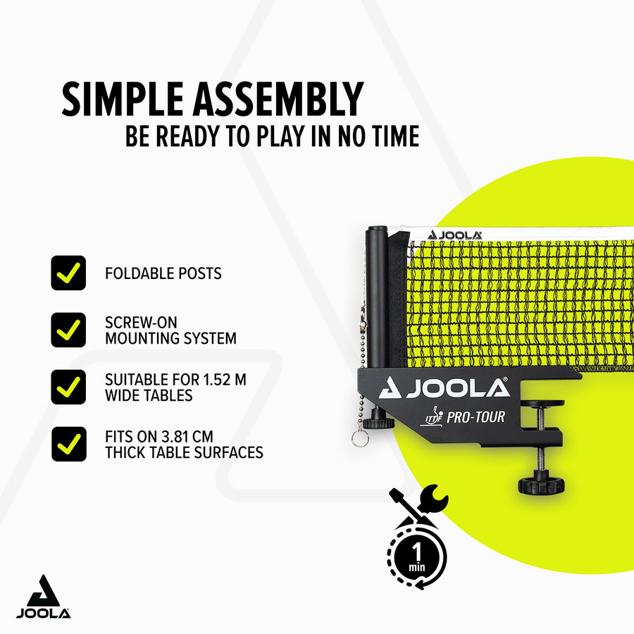 Experience professional playing conditions with the JOOLA Net PRO TOUR – the ideal competition set for discerning table tennis players!