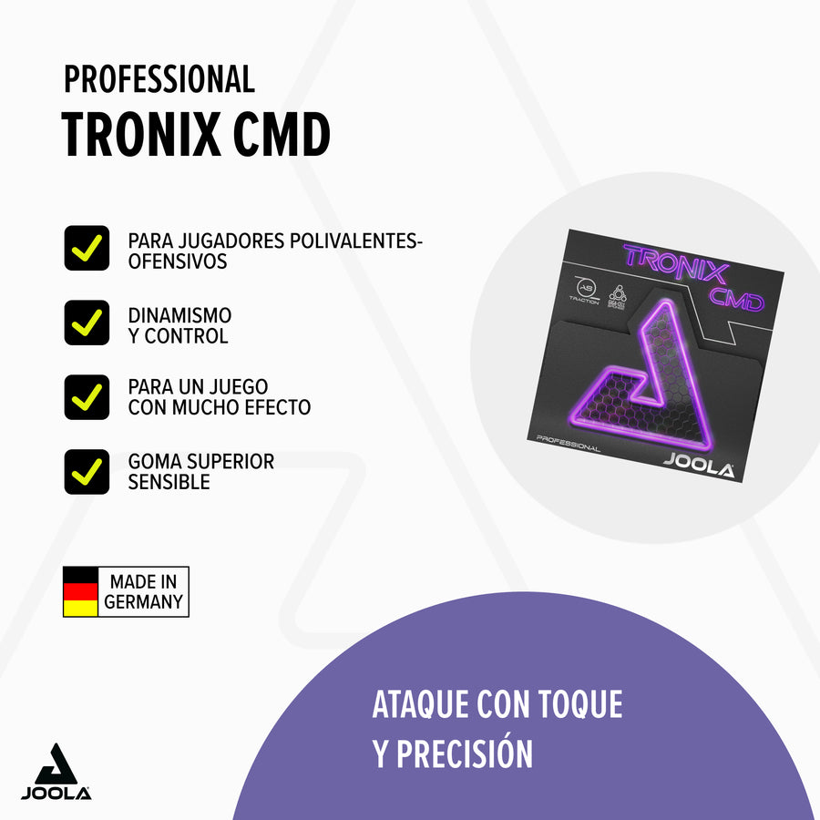 The JOOLA TRONIX CMD is perfect for players seeking a soft rubber who place particular emphasis on dynamism. The sensitive topsheet offers a soft touch and increases ball control. Due to the slightly flatter ball trajectory, your attacking shots are very powerful and direct. Ideal for your offensive allround play.