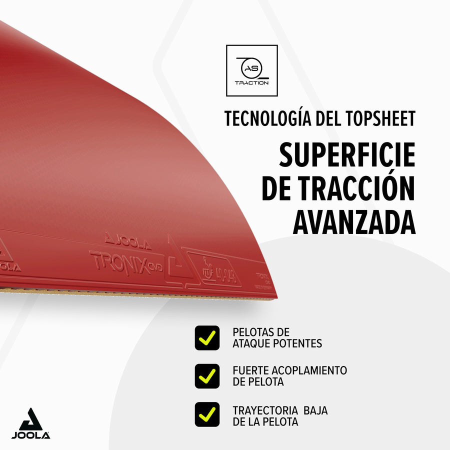 TRONIX CMD is based on an innovative sponge with exceptionally large pores and extraordinary thickness. The particularly thin ADVANCED TRACTION topsheet enables the thickest sponge in the entire JOOLA rubber series: the GIGA CELL sponge. This sponge is characterized by tremendous dynamism and a sensitive touch. Thanks to the soft 43° sponge, the rubber offers an extended ball contact time and an exceptional sound.