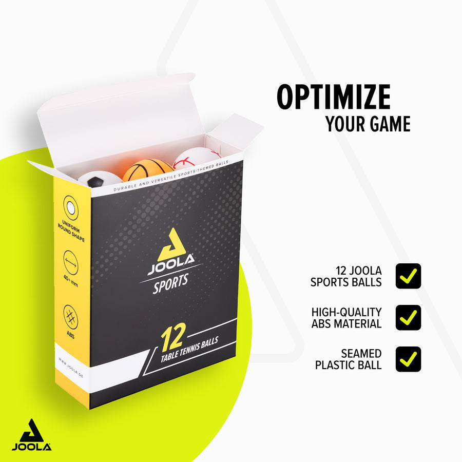 The JOOLA BALLSET SPORTS brings fun and variety to your table tennis game! These fun balls in a sports design are ideal for indoor, recreational, and outdoor use. Featuring designs reminiscent of football, basketball, baseball, and billiards, they ensure entertaining matches. This set also makes a great gift idea for table tennis and sports enthusiasts.
