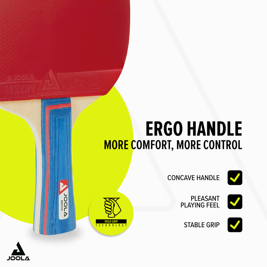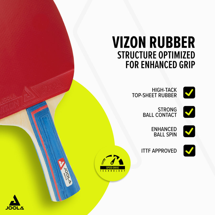- 2 JOOLA Match Paddles: The paddles feature 2.0 mm ITTF-approved JOOLA Vizon rubbers, offering excellent spin and speed performance.