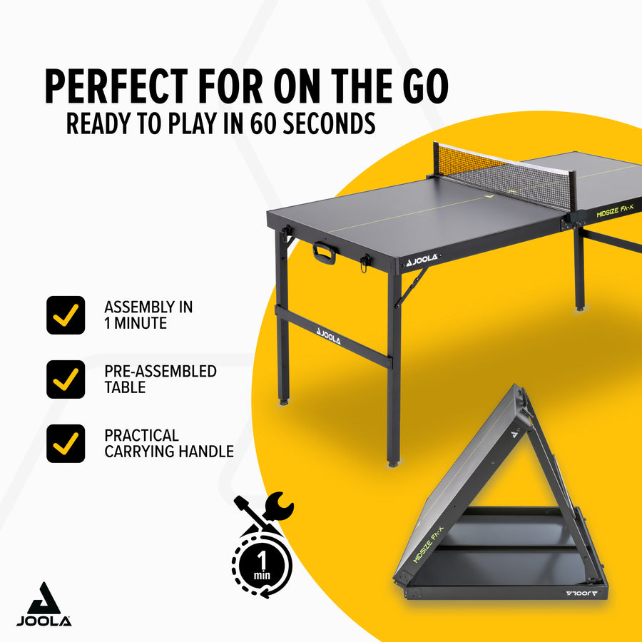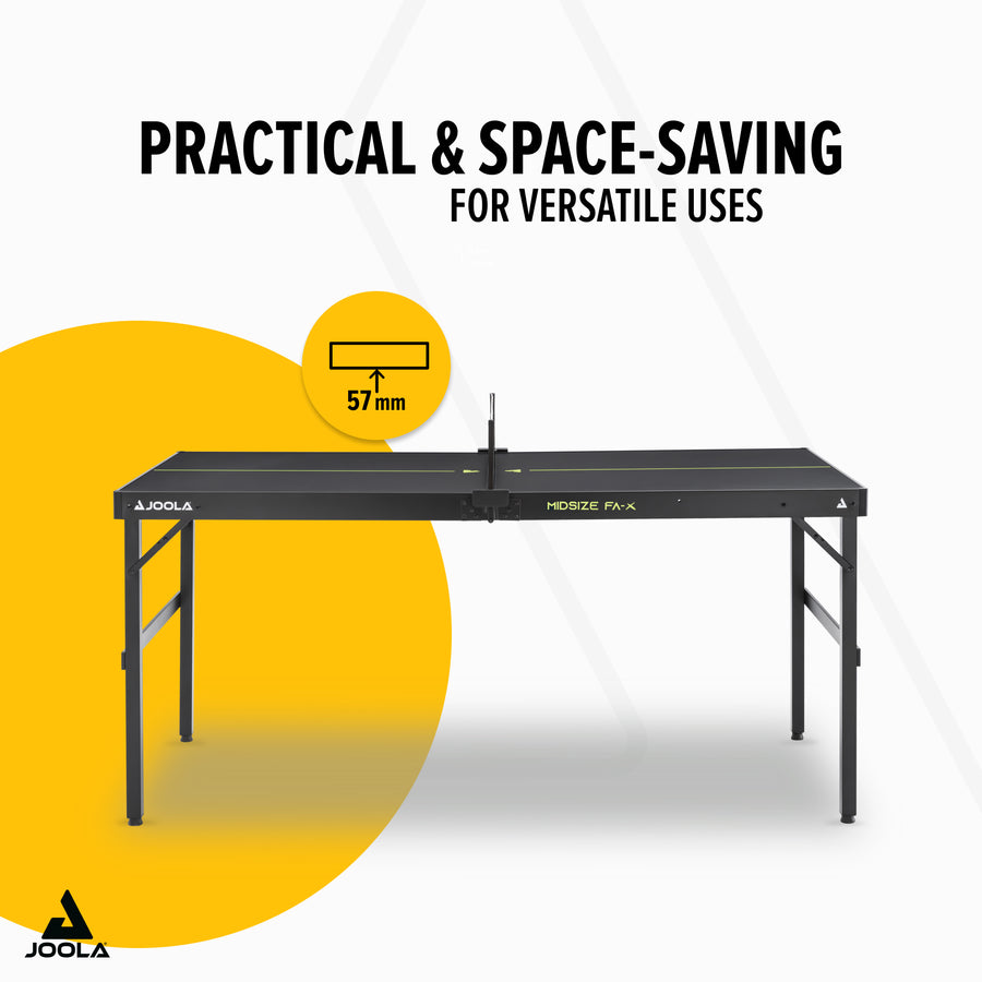 Do you want to play table tennis but don’t have room for a full-sized table? Then the JOOLA Midsize FA-X is made just for you. With its thoughtful design, modern lime-colored accents, and easy folding mechanism, any space can quickly transform into a playing zone.