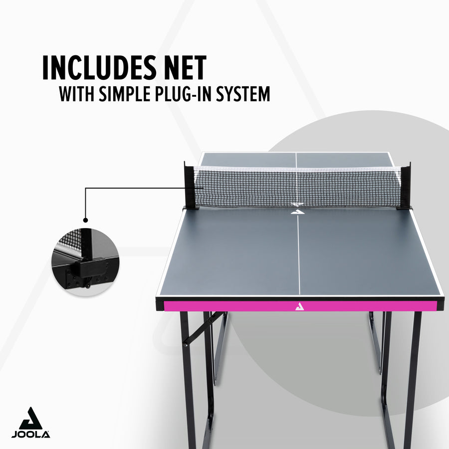 Are you looking for a table tennis table that not only takes up little space but also looks impressive? Then the JOOLA Midsize X is just right for you. With its modern look and an extra-wide purple frame, it’s a real eye-catcher – and incredibly practical to handle.