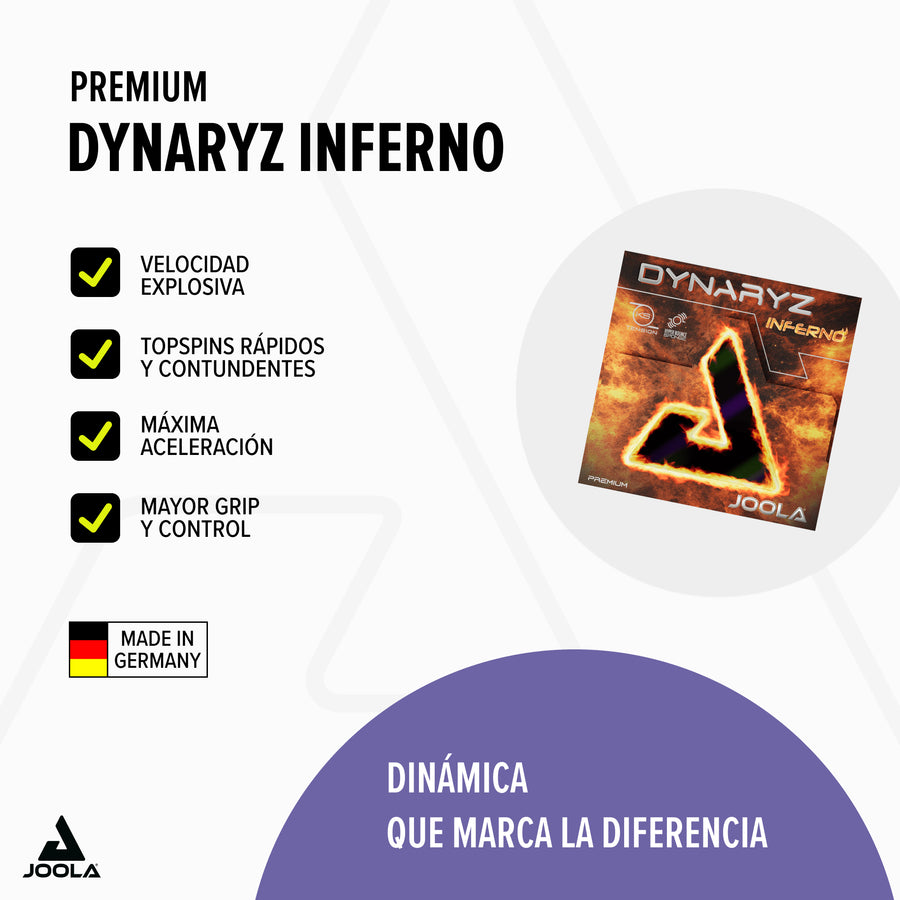 El JOOLA DYNARYZ INFERNO ofrece una aceleración y velocidad sin precedentes. Solo con observar la superficie KINETIC TENSION se puede apreciar a simple vista la extrema tensión previa gracias a las picas translúcidas. Este efecto catapulta resultante al impactar la bola hace que esta goma sea perfecta para topspins rápidos y potentes. Combinado con la esponja HYPER BOUNCE, se logran resultados dinámicos impresionantes que mantienen a tu oponente bajo constante presión.