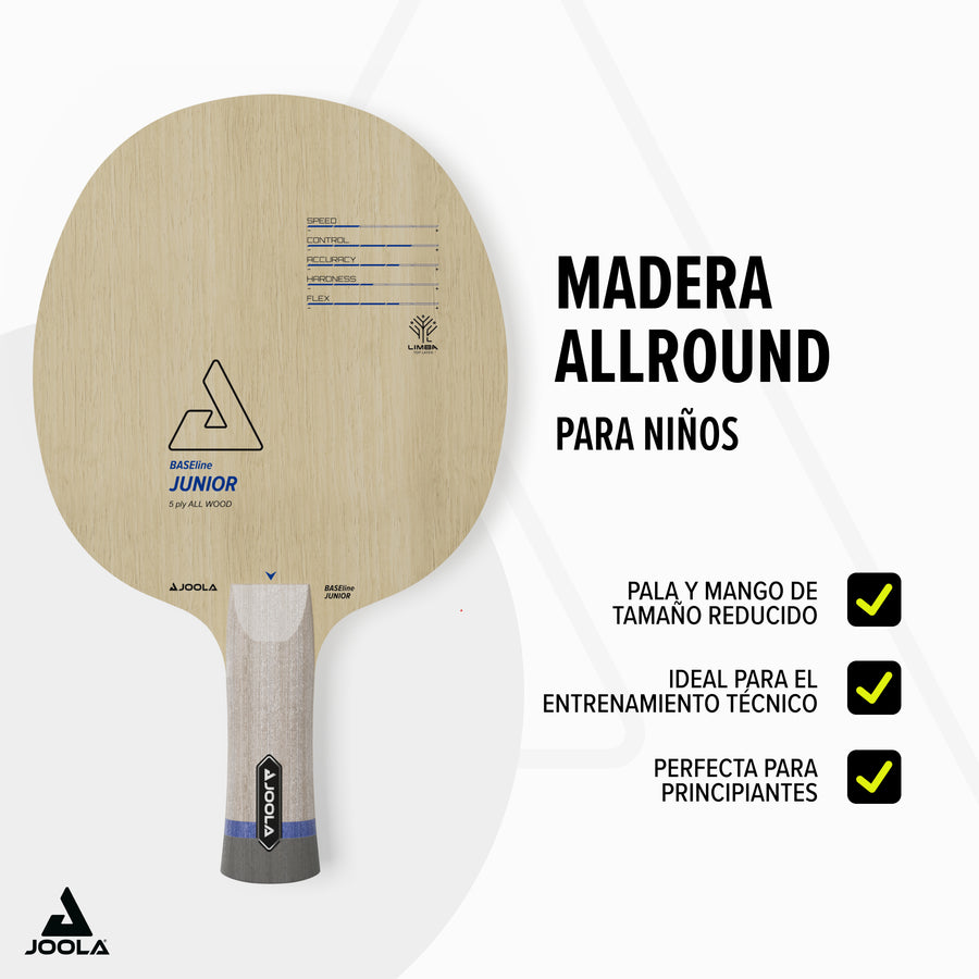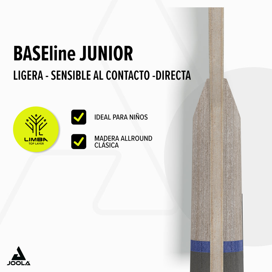 ¿Buscas una madera para pala que esté perfectamente adaptada a las manos de los niños? La BASEline JR está especialmente diseñada para jugadores jóvenes: una hoja de pala reducida, un mango extra estrecho y un peso inferior a 80 g, para que tu hijo disfrute y controle desde el primer momento en la mesa.