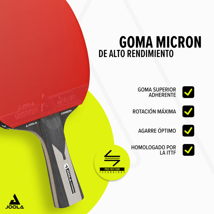 - Gomas MICRON aprobadas por la ITTF: Gracias a la tecnología PRO FRICTION, estas gomas ofrecen excelentes propiedades de efecto y velocidad, ideales para un juego dinámico y ofensivo.