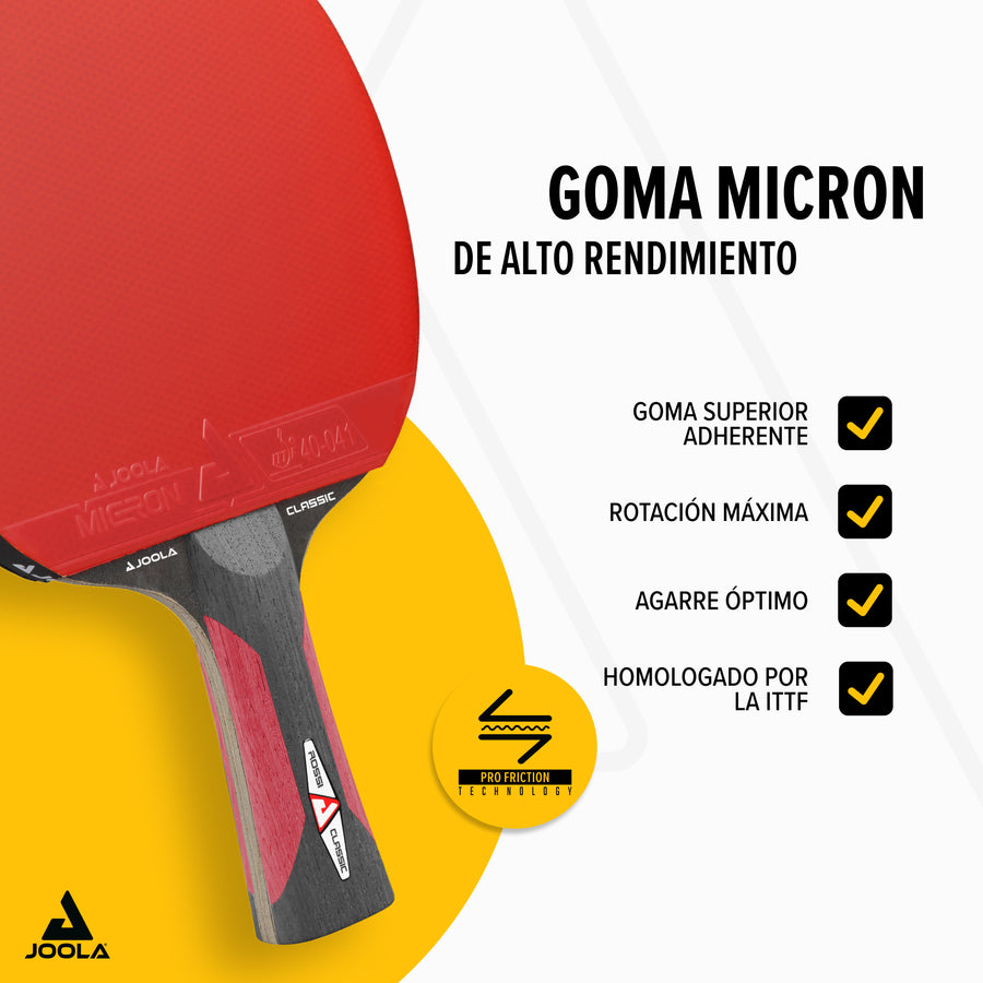 - Gomas JOOLA MICRON aprobadas por la ITTF: Estas gomas extremadamente adherentes proporcionan un máximo efecto y son ideales para un juego ofensivo de ataque.