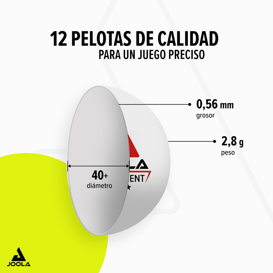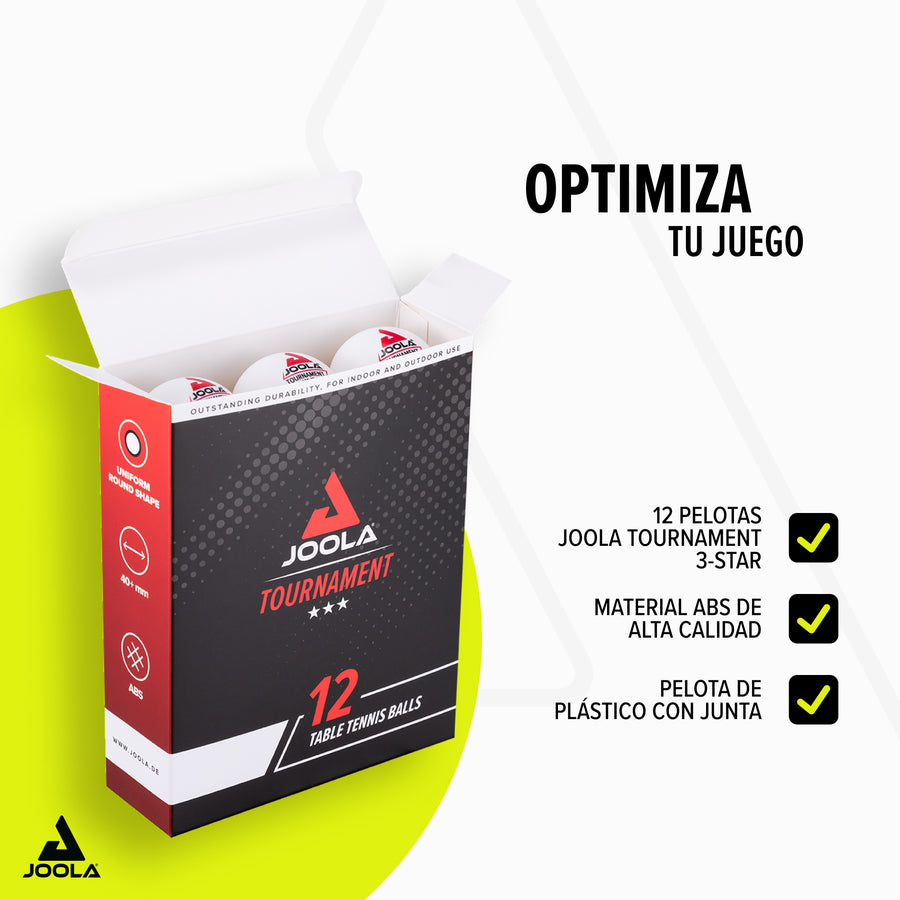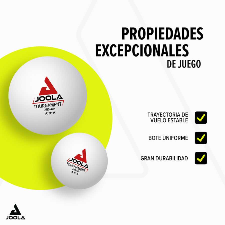 Las pelotas de tenis de mesa JOOLA TOURNAMENT*** 40+ ofrecen la combinación perfecta de calidad, durabilidad y disfrute del juego. Con su redondez excepcional y comportamiento constante al botar, son ideales para jugadores que entrenan y compiten a un alto nivel. Estas pelotas son tu mejor elección para un juego profesional de tenis de mesa, tanto en interiores como en exteriores.