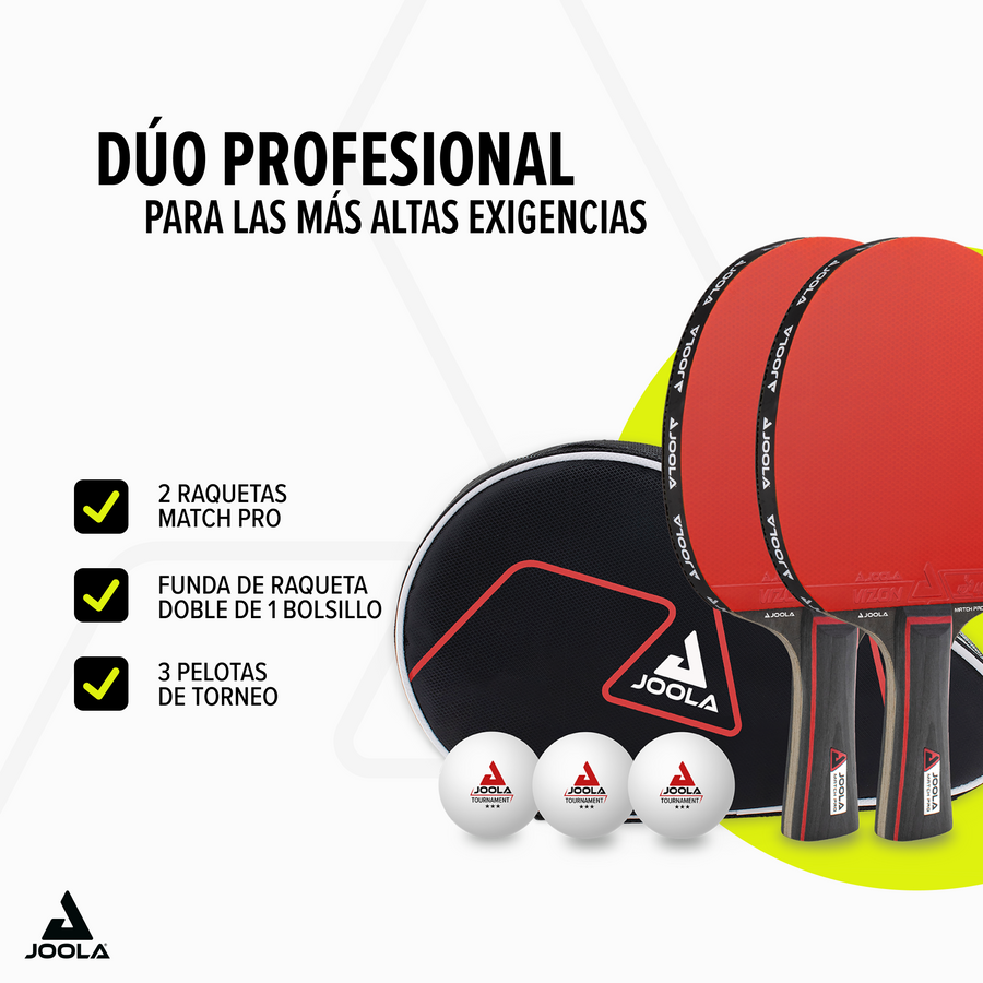 El im JOOLA Table Tennis Set Duo Pro contenido Match Joola por raqueta Son perfectos para los jugadores que valoran el control, el giro y la velocidad. El Cubiertas de Vizon con encierros para ITTF Proporcione una excelente rotación y dinámica de la pelota. Gracias a la Tecnología de accionamiento de velocidad Ofrezca a las raquetas un agarre extraordinario que puede usar para hacer cada golpe con precisión.