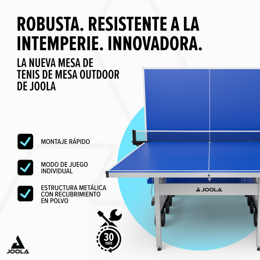 La JOOLA J500X es la mesa exterior perfecta para quienes no quieren comprometer la calidad de juego ni la comodidad. Resistente a la intemperie, móvil y estable – para partidos inolvidables al aire libre.