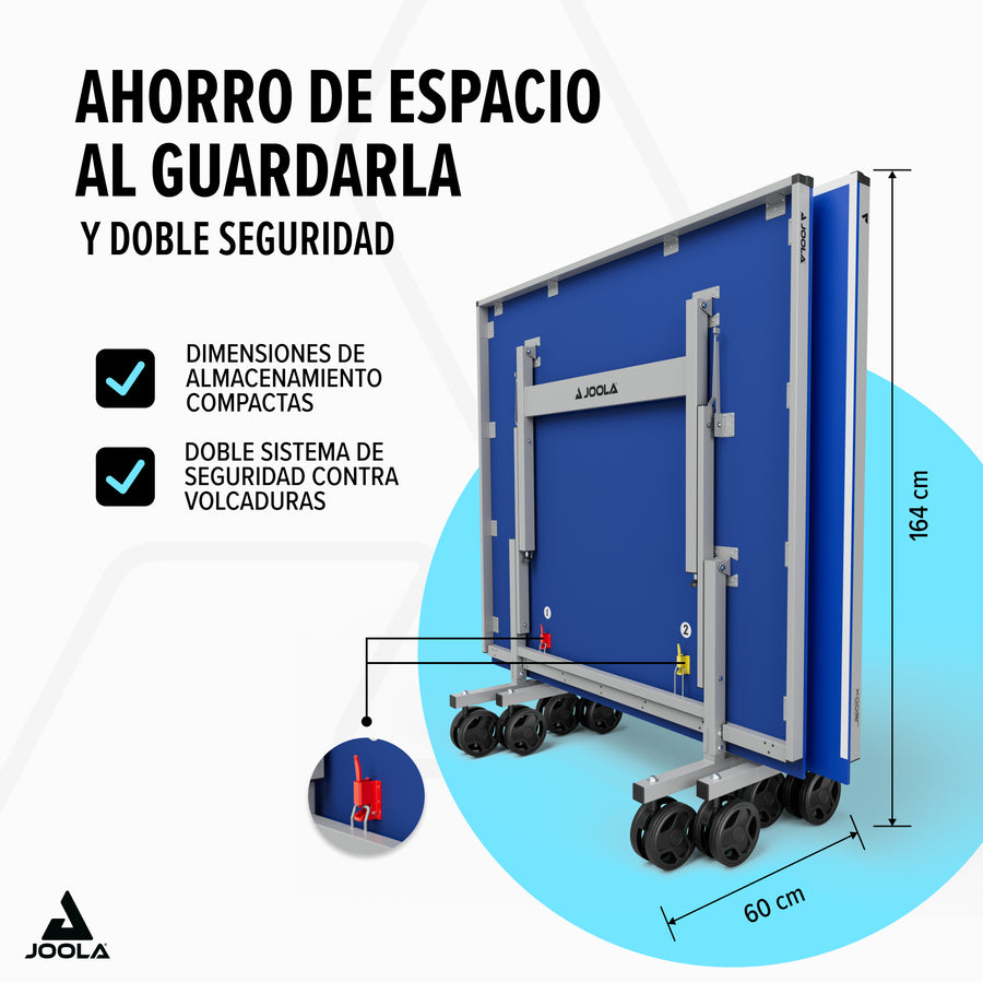 - Montaje y desmontaje rápidos – mitades plegables de la mesa que permiten un almacenamiento compacto y entrenamiento en solitario.
