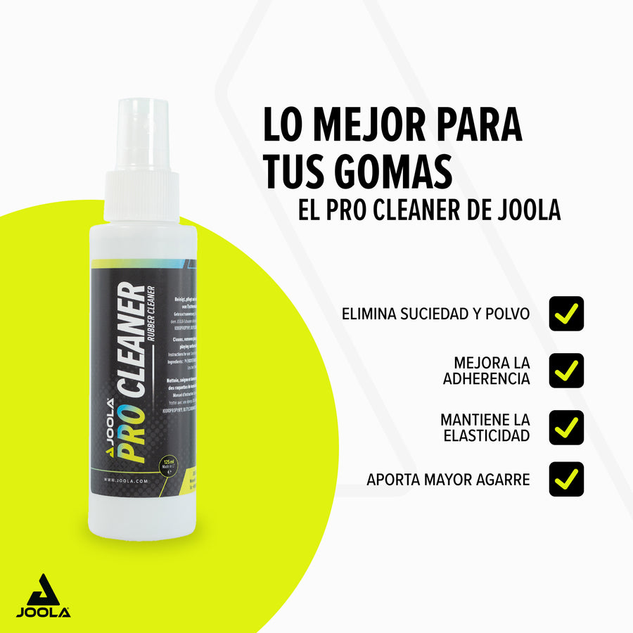 - JOOLA Pro Cleaner (125 ml): El limpiador de alta calidad elimina a fondo la suciedad y el polvo de tus gomas, mejora la adherencia y mantiene la elasticidad de las mismas.