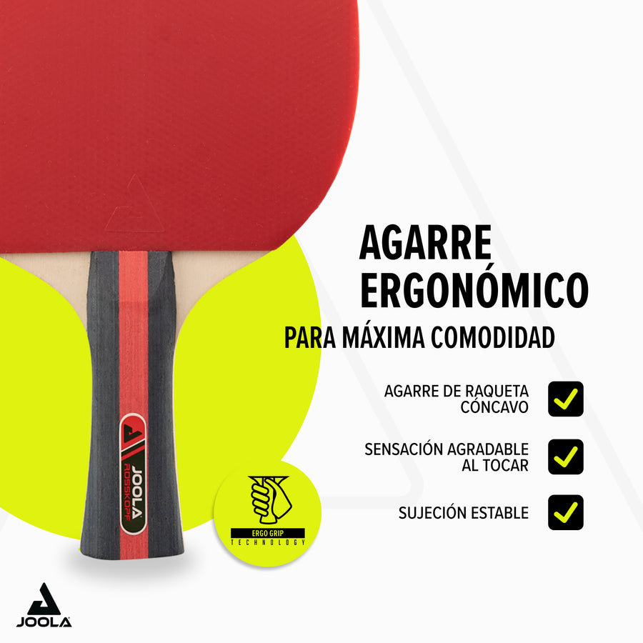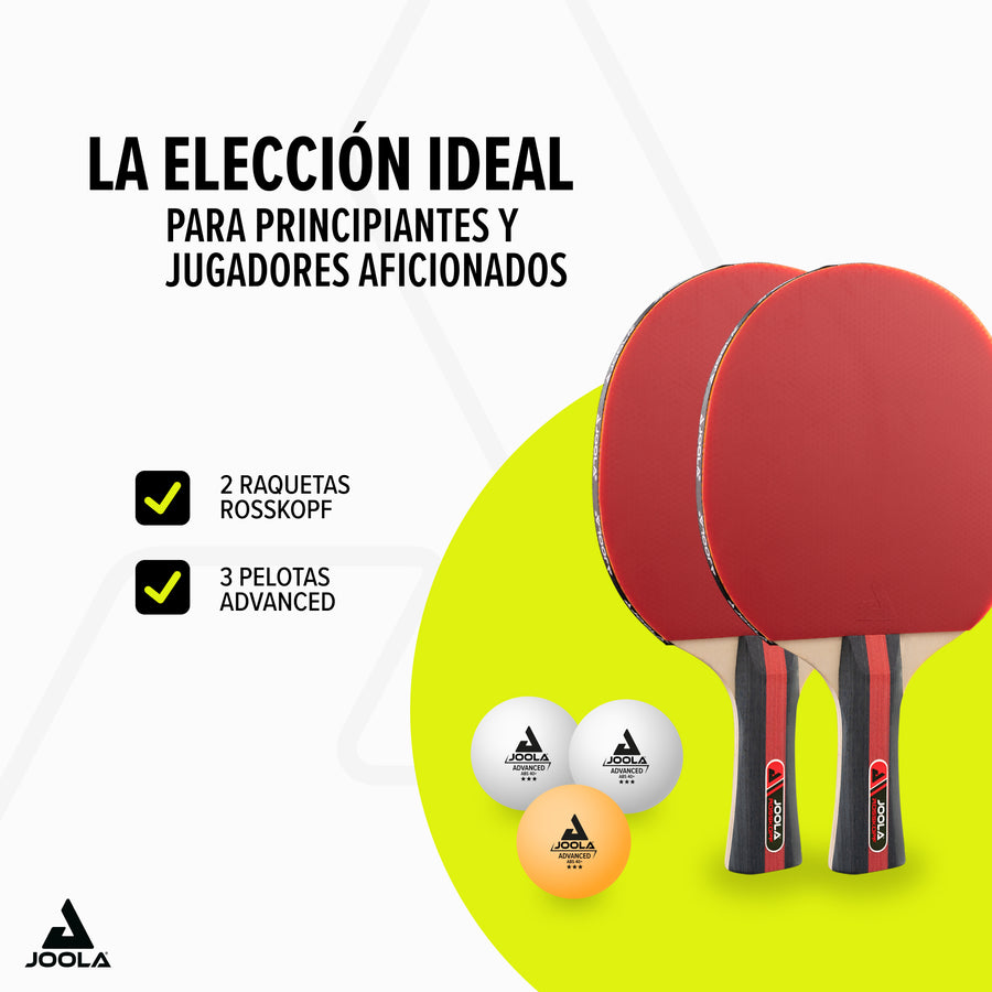 - Set completo: El set ROSSKOPF incluye dos palas de tenis de mesa y tres pelotas JOOLA Advanced Training***, para que puedas empezar a jugar de inmediato.