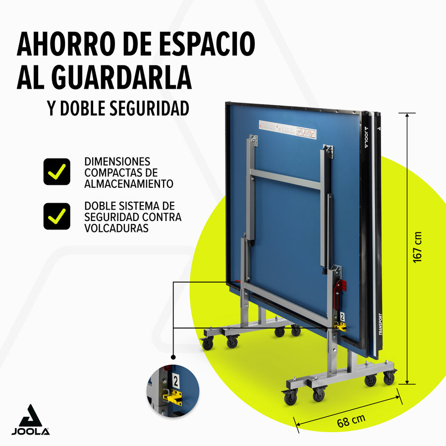 La mesa de tenis de mesa JOOLA Transport destaca por un sistema de transporte bien pensado, en el que cada mitad de la mesa se puede desplazar sobre 4 ruedas. Gracias a su superficie de 19 mm de grosor y a su construcción robusta, esta mesa es ideal para jugadores aficionados, clubes y la enseñanza escolar.